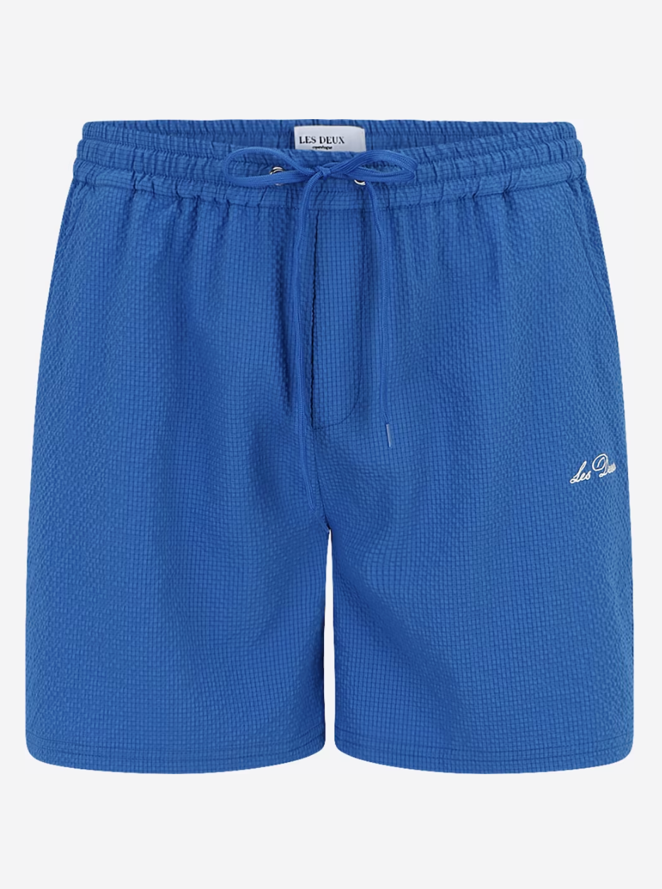 Royal-blaue Badehose mit Musterung im Obermaterial und Hosentaschen an beiden Seiten. Schnürung am Bund.