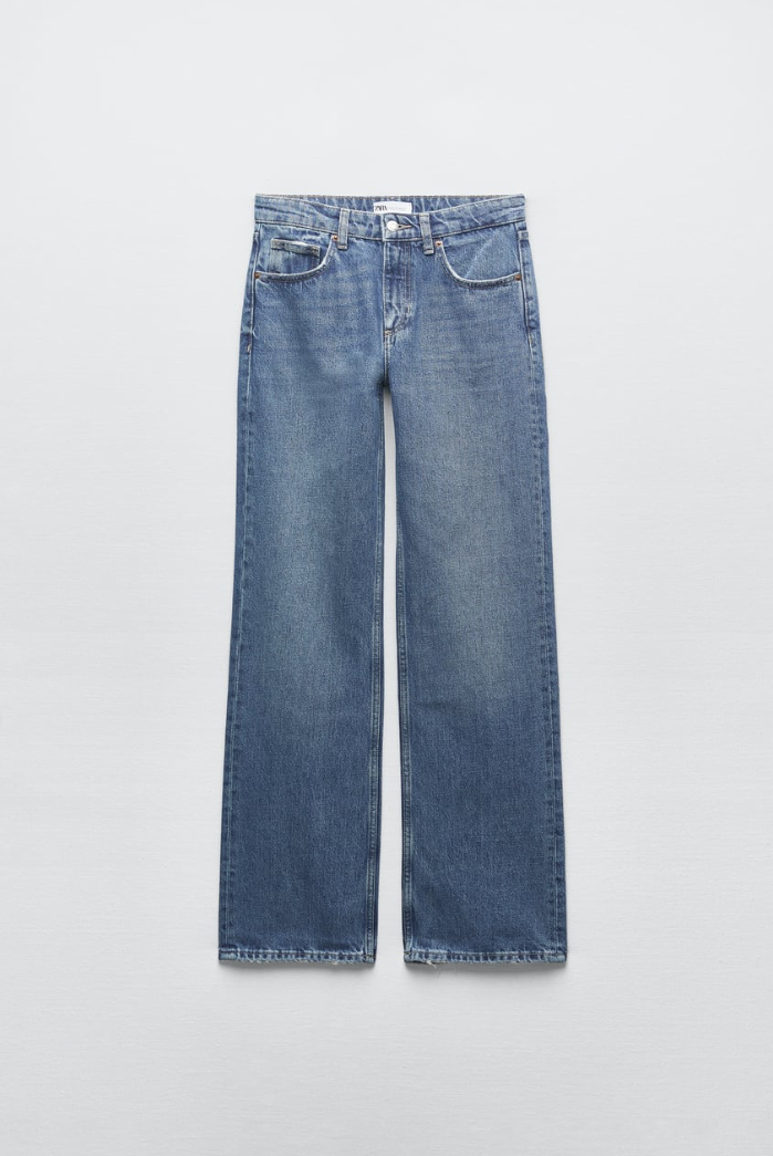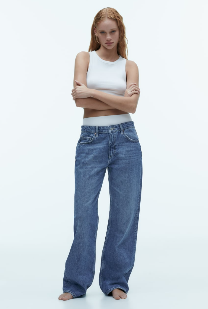 Jeans aus festem Stoff mit mittelhohem Bund. Five-Pocket-Stil. Weites, extralanges Bein